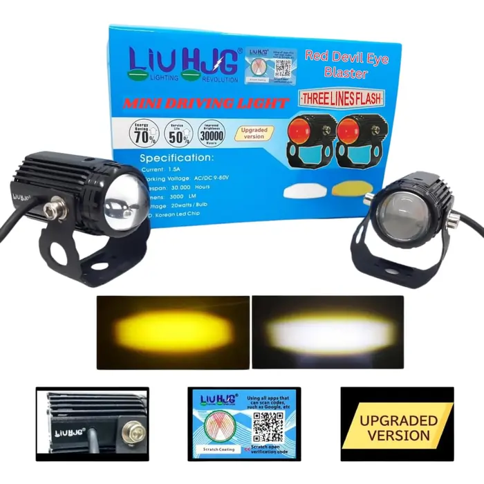 LIU HJG Mini Drive LED Fog Light Bulb Lamp is a versatile and powerful lighting solution designed for both cars and motorcycles. Triple-Color Lighting: Offers White, Yellow, and Red lighting options for versatile use.Easy switching between colors for different conditions or preferences. Powerful Illumination: 40W combined power delivers bright and efficient lighting.Enhanced visibility for night driving, fog, rain, and off-road conditions. Durable Build: Weather-resistant and robust construction to withstand tough environments.Long-lasting LED technology for reduced maintenance. Compact and Stylish Design: Sleek “Red Devil” mini design adds a stylish edge to your vehicle.Lightweight and easy to install. Universal Fit:Designed for compatibility with bikes, cars, jeeps, and other vehicles.