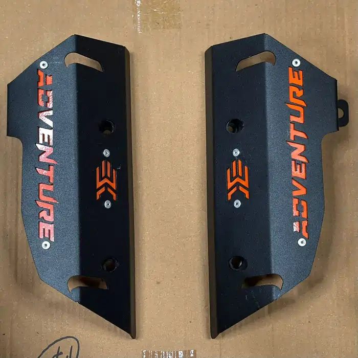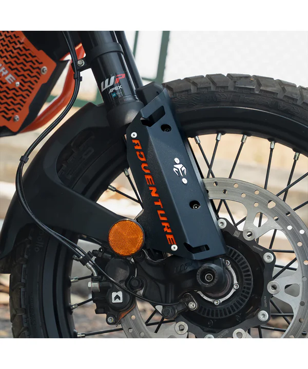 Heavy-duty metal fork protectors designed specifically for 2025 KTM 390 Adventure and Adventure X models.