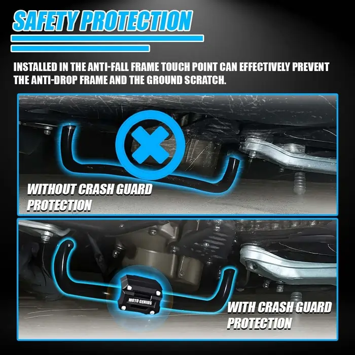 -  Enhanced Engine & Side Protection : This bumper guard acts as a first line of defense for your motorcycle’s engine, side covers, and fairings. Designed to absorb impact from low-speed tip-overs, parking accidents, or minor slides, it significantly reduces the risk of costly damage to vital components.